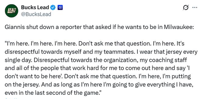- 曝雄鹿放話字母哥絕對(duì)不會(huì)離隊(duì)!本人回應(yīng)去留:別再問我這個(gè)問題