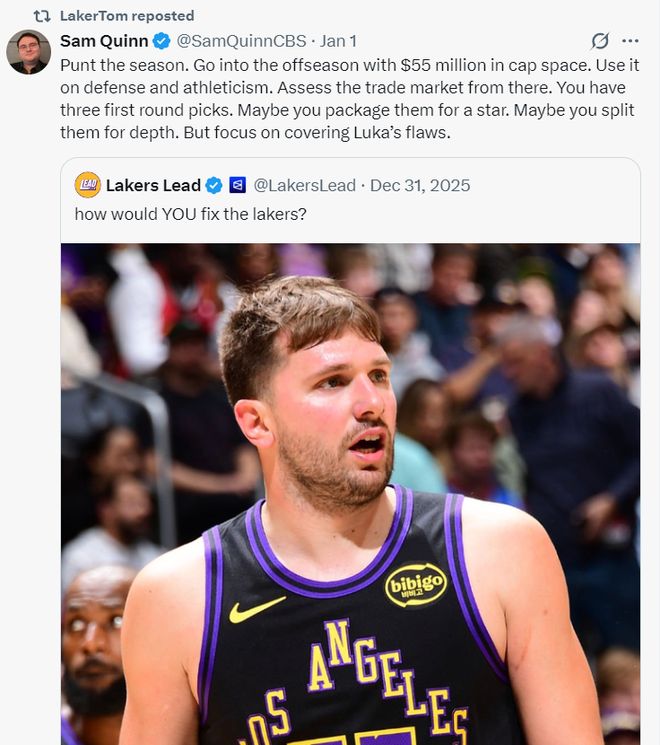 1月1日時(shí)CBS記者薩姆-奎因這樣建議:放棄這個(gè)賽季吧,休賽期手握5500萬(wàn)的薪金空間,用這筆錢(qián)來(lái)補(bǔ)強(qiáng)防守與運(yùn)動(dòng)能力,然后還可以評(píng)估交易市場(chǎng),今夏湖人有三個(gè)可以交易的首輪簽足夠打包換來(lái)一個(gè)球星,或者拆分增加陣容深度,重點(diǎn)是彌補(bǔ)東契奇防守端的不足。