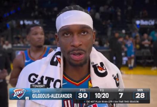 1月3日,雷霆131比94戰(zhàn)勝勇士,本場比賽雷霆球員亞歷山大全場20投10中,三分球5投3中,罰球7投7中,貢獻30分1籃板7助攻!