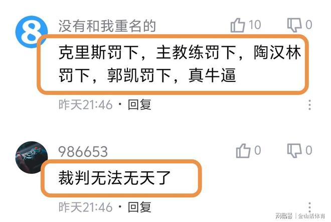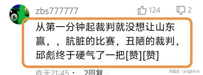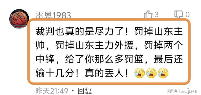 “裁判也真的是盡力了!罰掉山東主帥,罰掉山東主力外援,罰掉兩個(gè)中鋒,給了你那么多罰籃,最后還輸十幾分!真的丟人!”;“叼著個(gè)哨子胡吹,我說(shuō)心里話”;“克里斯罰下,主教練罰下,陶漢林罰下,郭凱罰下,真牛逼!”;“這主場(chǎng)哨真黑呀!”……