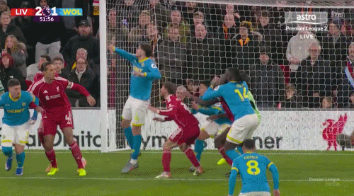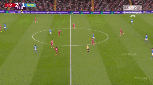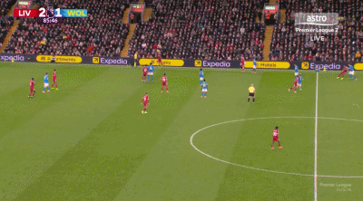 77分鐘,利物浦反擊丟球后前場(chǎng)有4名進(jìn)攻球員無法及時(shí)回防,狼隊(duì)利用這個(gè)機(jī)會(huì)快速反擊,在禁區(qū)前從容拿球、分球,邊路傳中后頭球攻門。