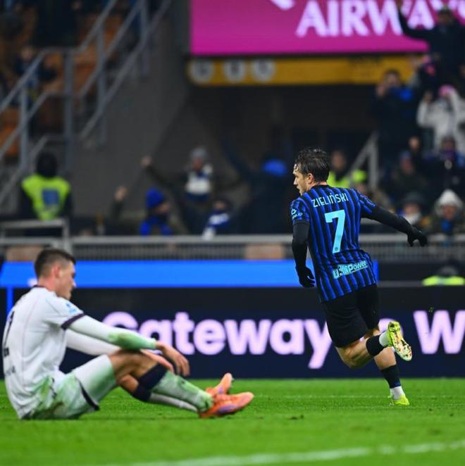 第26分鐘國(guó)米再次制造殺機(jī),巴斯托尼的甩頭攻門,再次被博洛尼亞的門將拒之門外,不過(guò)狂攻不止的國(guó)米,還是在半場(chǎng)結(jié)束前打破了場(chǎng)上的平衡,勞塔羅右路牽制防守后,無(wú)私橫傳給了左路,澤林斯基迎球怒射建功,國(guó)米帶著1-0的優(yōu)勢(shì),回到了中場(chǎng)更衣室。
