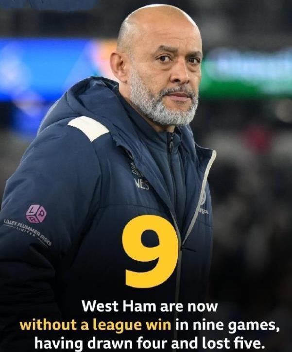 努諾本賽季中途接手西漢姆聯(lián)教鞭至今,帶隊(duì)15場(chǎng)僅獲得2場(chǎng)勝利,目前更是連續(xù)9輪英超不勝(4平5負(fù)),球隊(duì)深陷降級(jí)區(qū)且防守崩盤(西漢姆聯(lián)20輪英超狂丟41球,失球數(shù)英超最多)。根據(jù)數(shù)據(jù)統(tǒng)計(jì)顯示,這是西漢姆聯(lián)自2011年之后,首次在英超賽場(chǎng)遭遇如此漫長的連續(xù)不勝?;厮?010/11賽季,鐵錘幫曾從那個(gè)賽季3月的第30輪聯(lián)賽起,連續(xù)9場(chǎng)比賽未嘗勝績(jī)(2平7負(fù)),最終以38輪積33分的成績(jī)排名聯(lián)賽墊底慘遭降級(jí)。